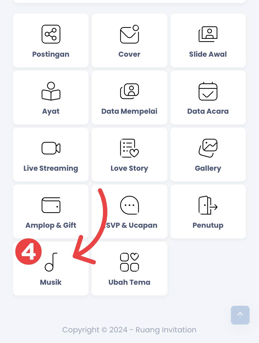 4. Selanjutnya kita akan mengubah lagu pada undagan website kita, pastikan kamu berada pada halaman edit undangan lalu klik menu Music.