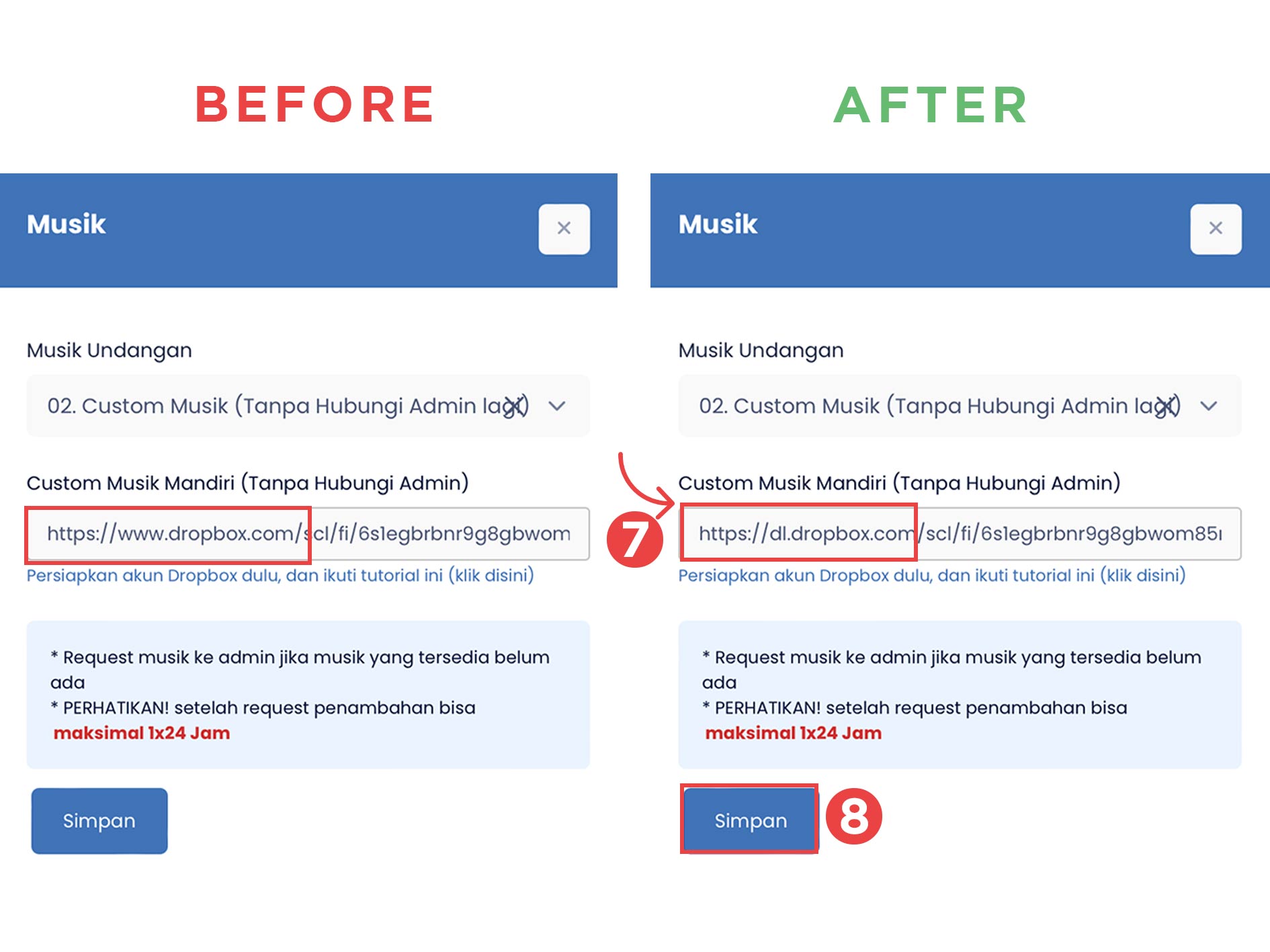 7. Ini merupakan langkah penting, agar lagu dapat digunakan terlebih dahulu kamu harus memodifikasi link dari Dropbox. Pada awalan link/url edit kata-kata www.dropbox.com menjadi dl.dropbox.com (lihat gambar).